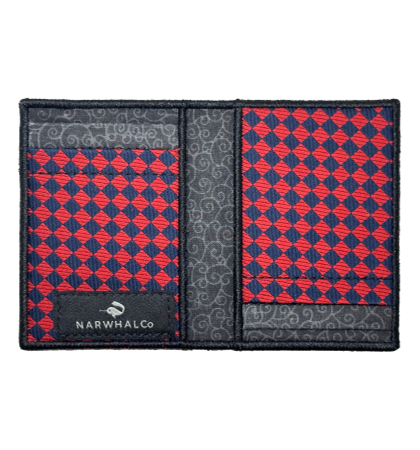 Narwhal Company :: Tie Fold Wallet - Men’s designer wallet that’s unique, just for you. This unique, bifold wallet, is made from an original, vintage, recycled, polyester, vintage neckties. It has the largest capacity of the tie wallets produced by Narwhal. Each side of the interior has two card pockets, which can each hold 2-3 cards, with an additional inside pocket on each side.  Whether it’s dollars, euro’s, yen or any other bank note, there are six individual places to put your things, all the while keeping a minimal profile. It’s a unique women’s wallet too for its ability to easily transfer cards from purse to purse.  Because they are one-of-a-kind, they are personalized wallets you can brag about and show to anyone.