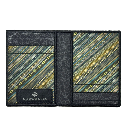 Narwhal Company :: Tie Fold Wallet - Men’s designer wallet that’s unique, just for you. This unique, bifold wallet, is made from an original, vintage, recycled, polyester, vintage neckties. It has the largest capacity of the tie wallets produced by Narwhal. Each side of the interior has two card pockets, which can each hold 2-3 cards, with an additional inside pocket on each side.  Whether it’s dollars, euro’s, yen or any other bank note, there are six individual places to put your things, all the while keeping a minimal profile. It’s a unique women’s wallet too for its ability to easily transfer cards from purse to purse.  Because they are one-of-a-kind, they are personalized wallets you can brag about and show to anyone.