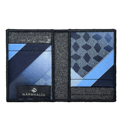Narwhal Company :: Tie Fold Wallet - Men’s designer wallet that’s unique, just for you. This unique, bifold wallet, is made from an original, vintage, recycled, polyester, vintage neckties. It has the largest capacity of the tie wallets produced by Narwhal. Each side of the interior has two card pockets, which can each hold 2-3 cards, with an additional inside pocket on each side.  Whether it’s dollars, euro’s, yen or any other bank note, there are six individual places to put your things, all the while keeping a minimal profile. It’s a unique women’s wallet too for its ability to easily transfer cards from purse to purse.  Because they are one-of-a-kind, they are personalized wallets you can brag about and show to anyone.