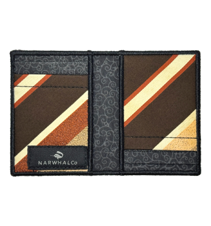 Narwhal Company :: Tie Fold Wallet - Men’s designer wallet that’s unique, just for you. This unique, bifold wallet, is made from an original, vintage, recycled, polyester, vintage neckties. It has the largest capacity of the tie wallets produced by Narwhal. Each side of the interior has two card pockets, which can each hold 2-3 cards, with an additional inside pocket on each side.  Whether it’s dollars, euro’s, yen or any other bank note, there are six individual places to put your things, all the while keeping a minimal profile. It’s a unique women’s wallet too for its ability to easily transfer cards from purse to purse.  Because they are one-of-a-kind, they are personalized wallets you can brag about and show to anyone.