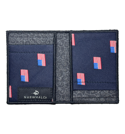 Narwhal Company :: Tie Fold Wallet - Men’s designer wallet that’s unique, just for you. This unique, bifold wallet, is made from an original, vintage, recycled, polyester, vintage neckties. It has the largest capacity of the tie wallets produced by Narwhal. Each side of the interior has two card pockets, which can each hold 2-3 cards, with an additional inside pocket on each side.  Whether it’s dollars, euro’s, yen or any other bank note, there are six individual places to put your things, all the while keeping a minimal profile. It’s a unique women’s wallet too for its ability to easily transfer cards from purse to purse.  Because they are one-of-a-kind, they are personalized wallets you can brag about and show to anyone.