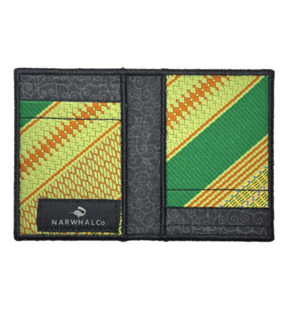 Narwhal Company :: Tie Fold Wallet - Men’s designer wallet that’s unique, just for you. This unique, bifold wallet, is made from an original, vintage, recycled, polyester, vintage neckties. It has the largest capacity of the tie wallets produced by Narwhal. Each side of the interior has two card pockets, which can each hold 2-3 cards, with an additional inside pocket on each side.  Whether it’s dollars, euro’s, yen or any other bank note, there are six individual places to put your things, all the while keeping a minimal profile. It’s a unique women’s wallet too for its ability to easily transfer cards from purse to purse.  Because they are one-of-a-kind, they are personalized wallets you can brag about and show to anyone.