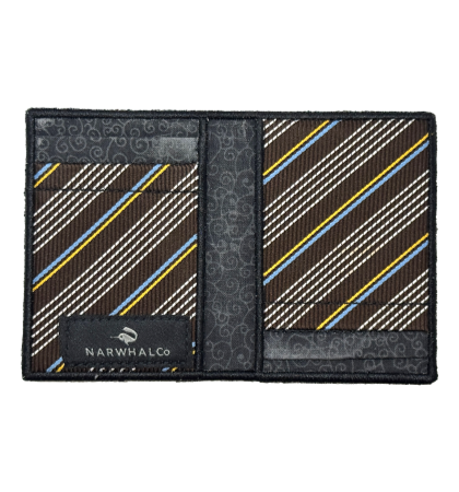 Narwhal Company :: Tie Fold Wallet - Men’s designer wallet that’s unique, just for you. This unique, bifold wallet, is made from an original, vintage, recycled, polyester, vintage neckties. It has the largest capacity of the tie wallets produced by Narwhal. Each side of the interior has two card pockets, which can each hold 2-3 cards, with an additional inside pocket on each side.  Whether it’s dollars, euro’s, yen or any other bank note, there are six individual places to put your things, all the while keeping a minimal profile. It’s a unique women’s wallet too for its ability to easily transfer cards from purse to purse.  Because they are one-of-a-kind, they are personalized wallets you can brag about and show to anyone.