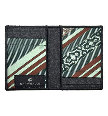 Narwhal Company :: Tie Fold Wallet - Men’s designer wallet that’s unique, just for you. This unique, bifold wallet, is made from an original, vintage, recycled, polyester, vintage neckties. It has the largest capacity of the tie wallets produced by Narwhal. Each side of the interior has two card pockets, which can each hold 2-3 cards, with an additional inside pocket on each side.  Whether it’s dollars, euro’s, yen or any other bank note, there are six individual places to put your things, all the while keeping a minimal profile. It’s a unique women’s wallet too for its ability to easily transfer cards from purse to purse.  Because they are one-of-a-kind, they are personalized wallets you can brag about and show to anyone.