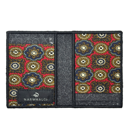 Narwhal Company :: Tie Fold Wallet - Men’s designer wallet that’s unique, just for you. This unique, bifold wallet, is made from an original, vintage, recycled, polyester, vintage neckties. It has the largest capacity of the tie wallets produced by Narwhal. Each side of the interior has two card pockets, which can each hold 2-3 cards, with an additional inside pocket on each side.  Whether it’s dollars, euro’s, yen or any other bank note, there are six individual places to put your things, all the while keeping a minimal profile. It’s a unique women’s wallet too for its ability to easily transfer cards from purse to purse.  Because they are one-of-a-kind, they are personalized wallets you can brag about and show to anyone.