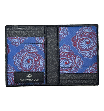 Narwhal Company :: Tie Fold Wallet - Men’s designer wallet that’s unique, just for you. This unique, bifold wallet, is made from an original, vintage, recycled, polyester, vintage neckties. It has the largest capacity of the tie wallets produced by Narwhal. Each side of the interior has two card pockets, which can each hold 2-3 cards, with an additional inside pocket on each side.  Whether it’s dollars, euro’s, yen or any other bank note, there are six individual places to put your things, all the while keeping a minimal profile. It’s a unique women’s wallet too for its ability to easily transfer cards from purse to purse.  Because they are one-of-a-kind, they are personalized wallets you can brag about and show to anyone.