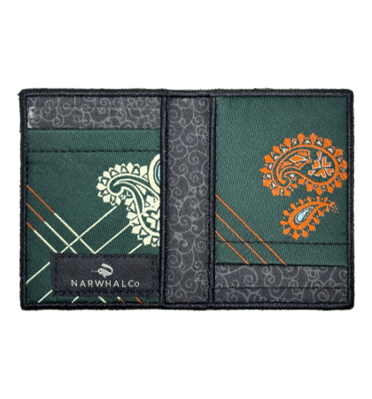 Narwhal Company :: Tie Fold Wallet - Men’s designer wallet that’s unique, just for you. This unique, bifold wallet, is made from an original, vintage, recycled, polyester, vintage neckties. It has the largest capacity of the tie wallets produced by Narwhal. Each side of the interior has two card pockets, which can each hold 2-3 cards, with an additional inside pocket on each side.  Whether it’s dollars, euro’s, yen or any other bank note, there are six individual places to put your things, all the while keeping a minimal profile. It’s a unique women’s wallet too for its ability to easily transfer cards from purse to purse.  Because they are one-of-a-kind, they are personalized wallets you can brag about and show to anyone.