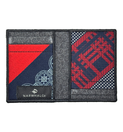 Narwhal Company :: Tie Fold Wallet - Men’s designer wallet that’s unique, just for you. This unique, bifold wallet, is made from an original, vintage, recycled, polyester, vintage neckties. It has the largest capacity of the tie wallets produced by Narwhal. Each side of the interior has two card pockets, which can each hold 2-3 cards, with an additional inside pocket on each side.  Whether it’s dollars, euro’s, yen or any other bank note, there are six individual places to put your things, all the while keeping a minimal profile. It’s a unique women’s wallet too for its ability to easily transfer cards from purse to purse.  Because they are one-of-a-kind, they are personalized wallets you can brag about and show to anyone.