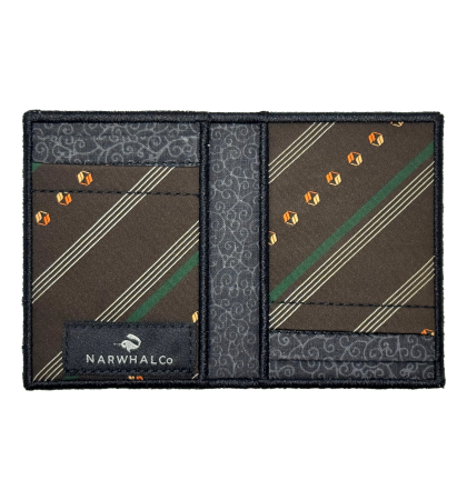 Narwhal Company :: Tie Fold Wallet - Men’s designer wallet that’s unique, just for you. This unique, bifold wallet, is made from an original, vintage, recycled, polyester, vintage neckties. It has the largest capacity of the tie wallets produced by Narwhal. Each side of the interior has two card pockets, which can each hold 2-3 cards, with an additional inside pocket on each side.  Whether it’s dollars, euro’s, yen or any other bank note, there are six individual places to put your things, all the while keeping a minimal profile. It’s a unique women’s wallet too for its ability to easily transfer cards from purse to purse.  Because they are one-of-a-kind, they are personalized wallets you can brag about and show to anyone.