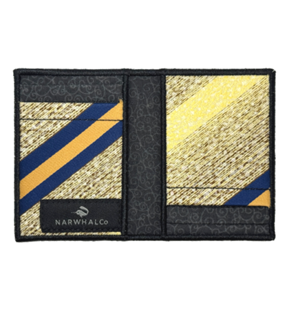 Narwhal Company :: Tie Fold Wallet - Men’s designer wallet that’s unique, just for you. This unique, bifold wallet, is made from an original, vintage, recycled, polyester, vintage neckties. It has the largest capacity of the tie wallets produced by Narwhal. Each side of the interior has two card pockets, which can each hold 2-3 cards, with an additional inside pocket on each side.  Whether it’s dollars, euro’s, yen or any other bank note, there are six individual places to put your things, all the while keeping a minimal profile. It’s a unique women’s wallet too for its ability to easily transfer cards from purse to purse.  Because they are one-of-a-kind, they are personalized wallets you can brag about and show to anyone.