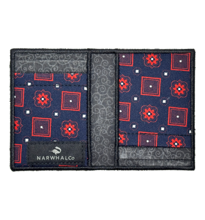 Narwhal Company :: Tie Fold Wallet - Men’s designer wallet that’s unique, just for you. This unique, bifold wallet, is made from an original, vintage, recycled, polyester, vintage neckties. It has the largest capacity of the tie wallets produced by Narwhal. Each side of the interior has two card pockets, which can each hold 2-3 cards, with an additional inside pocket on each side.  Whether it’s dollars, euro’s, yen or any other bank note, there are six individual places to put your things, all the while keeping a minimal profile. It’s a unique women’s wallet too for its ability to easily transfer cards from purse to purse.  Because they are one-of-a-kind, they are personalized wallets you can brag about and show to anyone.