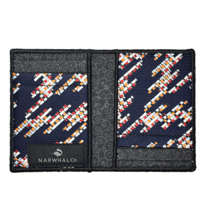 Narwhal Company :: Tie Fold Wallet - Men’s designer wallet that’s unique, just for you. This unique, bifold wallet, is made from an original, vintage, recycled, polyester, vintage neckties. It has the largest capacity of the tie wallets produced by Narwhal. Each side of the interior has two card pockets, which can each hold 2-3 cards, with an additional inside pocket on each side.  Whether it’s dollars, euro’s, yen or any other bank note, there are six individual places to put your things, all the while keeping a minimal profile. It’s a unique women’s wallet too for its ability to easily transfer cards from purse to purse.  Because they are one-of-a-kind, they are personalized wallets you can brag about and show to anyone.